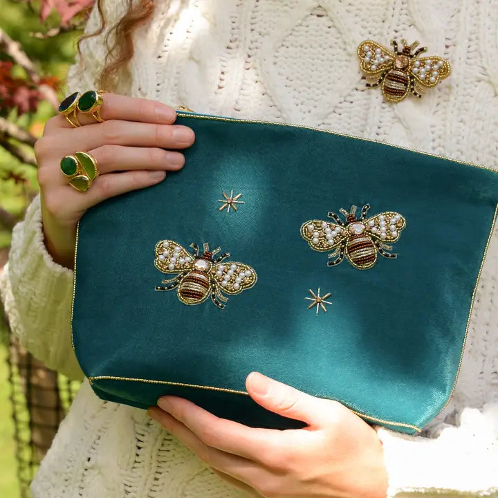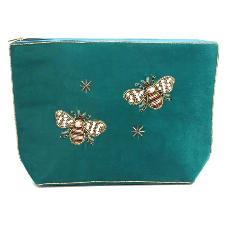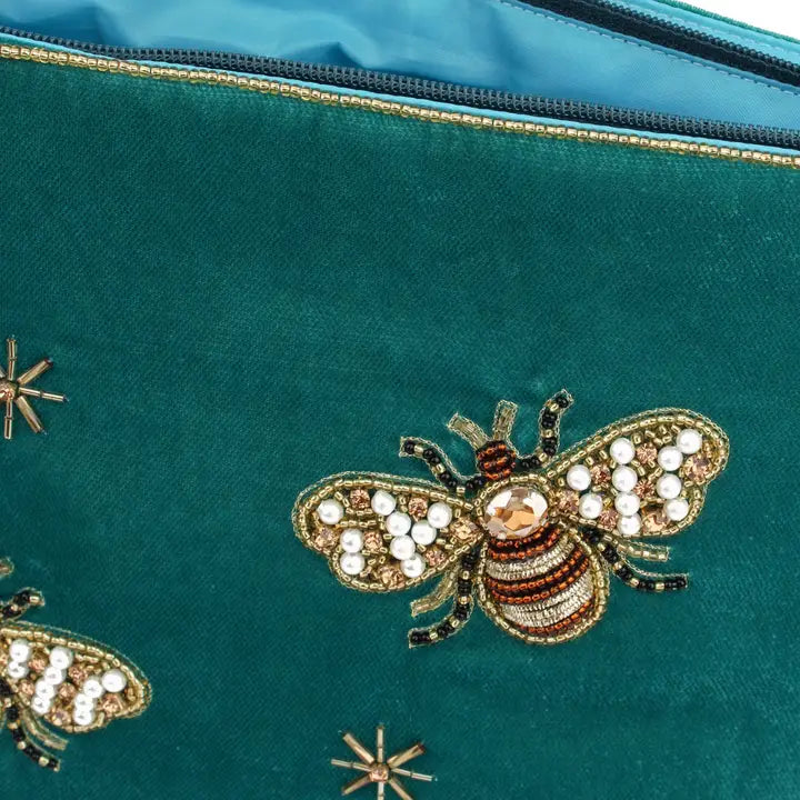 My Doris Teal Golden Bee Large Velvet Pouch