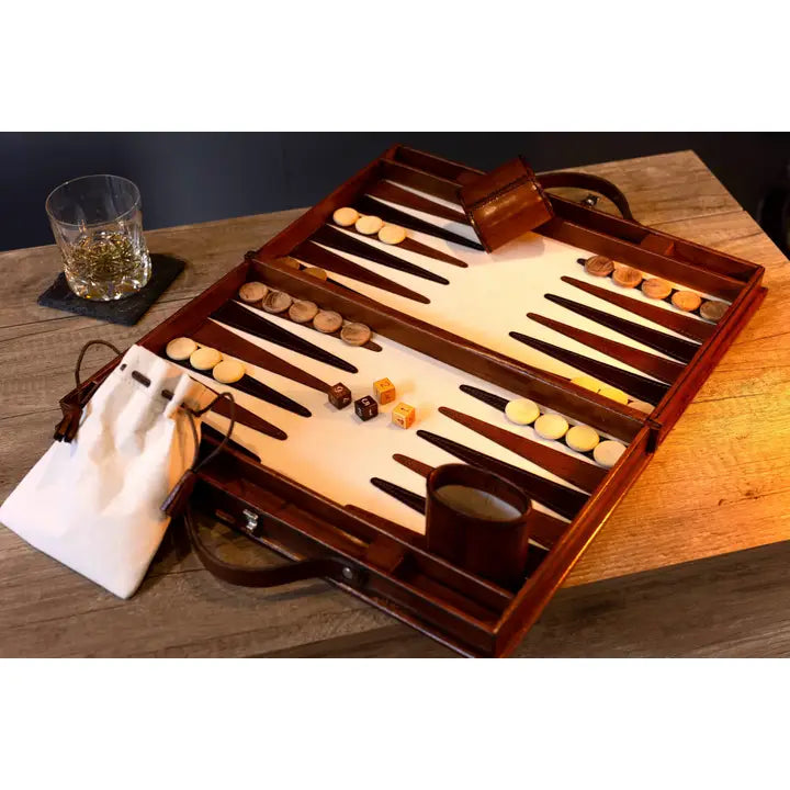 The thoughtfully designed case showcases an integrated faux suede playing board with authentic leather points, while wooden pieces and dice nestle securely in dedicated end compartments; no fumbling for missing pieces. A matching faux suede drawstring bag keeps everything organised between games, and two elegant oval-shaped leather dice shakers add a touch of refinement to every roll.