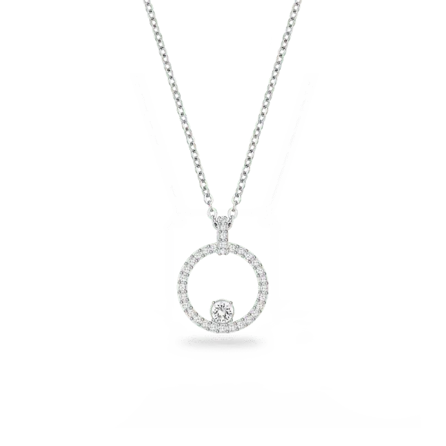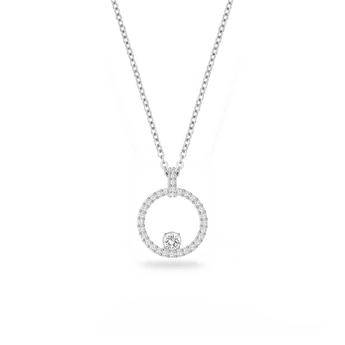 A stunning new interpretation of a timeless classic: the circle pendant. Highly refined, this design sparkles in clear crystal pavé. Rhodium-plated metal adds a modern touch. Wear with a longer pendant for an on-trend multi-length layered look. The pendant measures 1.5 x 2 cm and comes on a 38 cm chain.