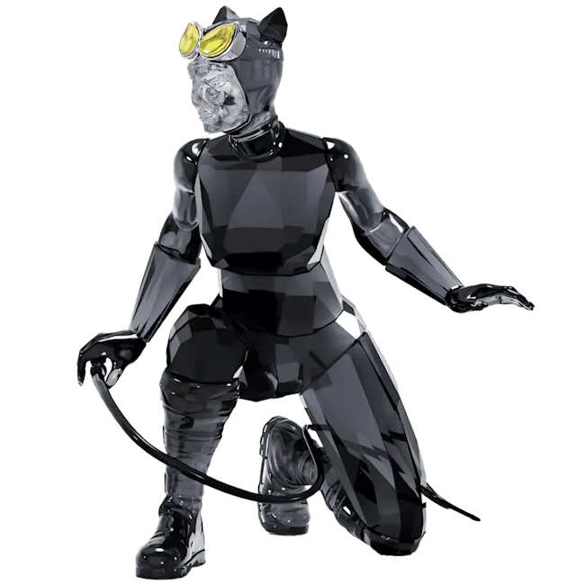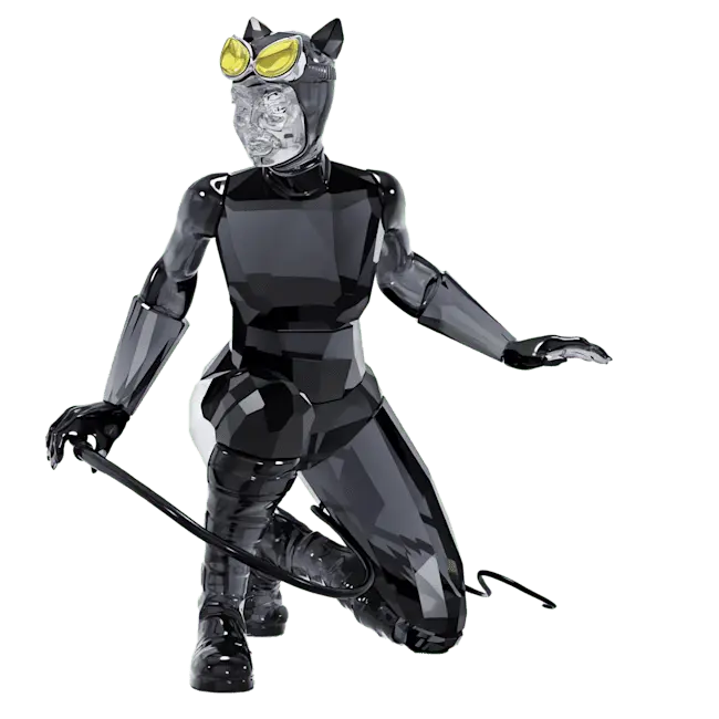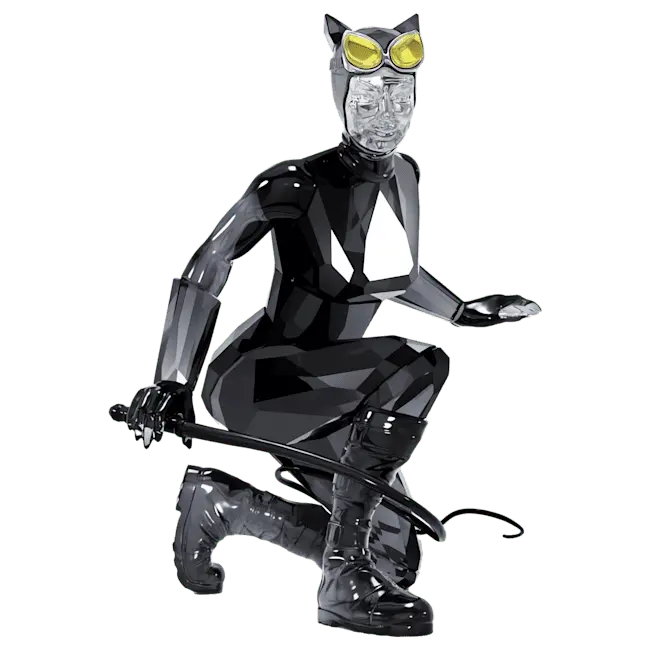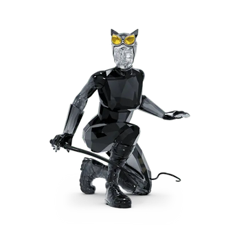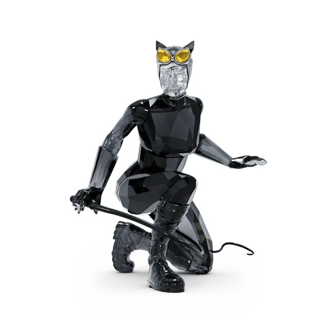 Joining our popular DC collection, this iconic design depicts the beautiful but deadly Catwoman. Crouched and ready to pounce, she wears a skintight catsuit with a mask, cat-eye goggles, gloves, chunky boots, and a whip. The design shines brilliantly with 517 facets of clear, black, and yellow crystal, with lacquered and nickel-coated metal accents. Batman fans and collectors will love this detailed and authentic statement piece. Decoration object. Not a toy. Not suitable for children under 15.