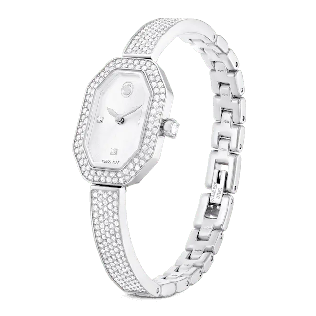 Crafted in the iconic octagon shape of Swarovski, this unique Dextera bangle watch is made for maximum glamour. The stainless steel case is 20mm x 30.5mm and is adorned with a pavé of 92 crystals on the bezel. This provides a perfect frame for the sunray dial, which features a swan logo at 12 o’clock and three crystallised index markers. Along with a single dazzling crystal set in the crown, the watch is also brought to life by 194 crystals set along the adjustable bracelet, providing exceptional beauty at every hour. This Swiss made watch is water resistant to 30m and combines joyful extravagance with signature Swarovski savoir-faire.