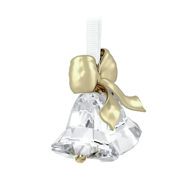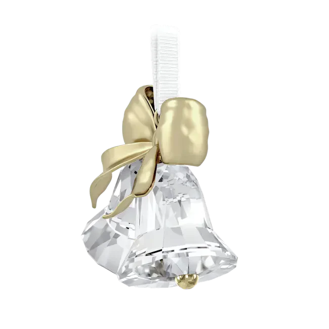 These crystallized bells are a sophisticated take on a traditional holiday motif. The elegant piece is illuminated with 244 facets and features clappers and a bow in a glossy champagne gold-tone metal. Suspended from a white grosgrain ribbon, this exquisitely crafted piece makes a stunning ornament. Decoration object. Not a toy. Not suitable for children under 15.