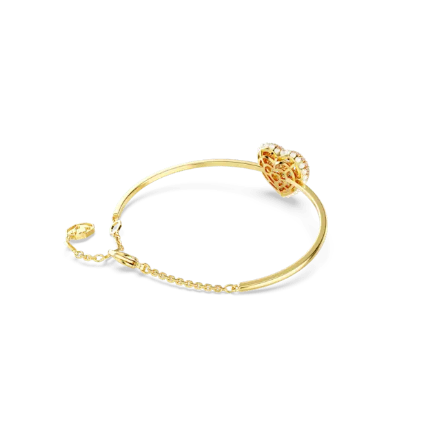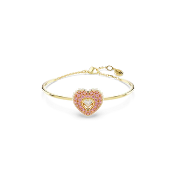 This gold-tone Idyllia bangle expresses love through a combination of colours and cuts. The heart-shaped motif has been created with a cage design for maximum volume and includes an array of tiny white Crystal Pearls around the edging. To enhance the domed effect, it is adorned with round pink Swarovski Zirconia, set in place using the dazzling chatonnage technique. At the centre, a heart-shaped dancing stone catches the light from every angle. Gift this as a special surprise to someone you adore.