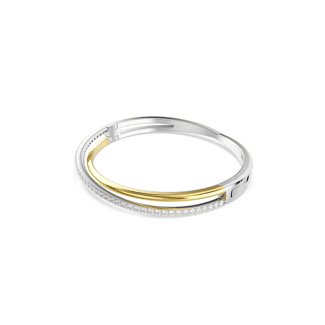 This twisting Hyperbola bangle is crafted with unmistakable Swarovski savoir-faire. The two overlapping bands are presented in a mix of gold-tone and rhodium plating, with round Swarovski Zirconia placed in a prong setting. An elegant way to inject intrigue into any outfit.