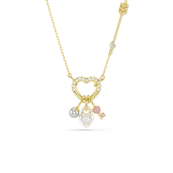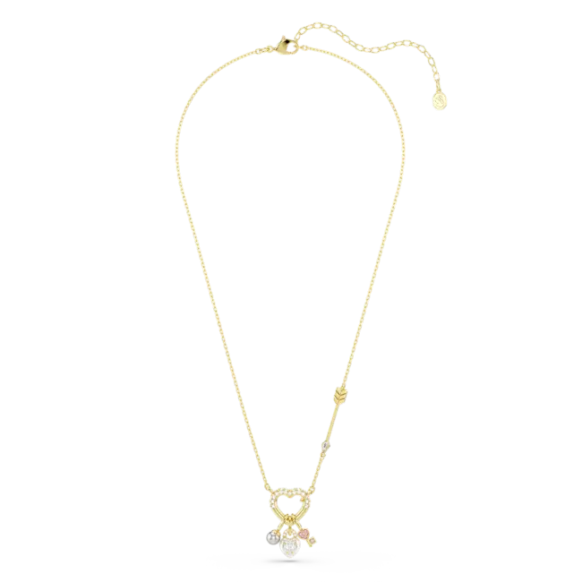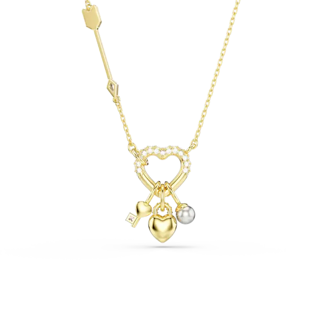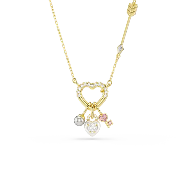 This versatile pendant allows you to express love in your own way. The gold-tone plated design features a heart-shaped carabiner at the center, with three small charms including a Swarovski Crystal Pearl, a white heart, and a key. Open the carabiner to remove or add more charms and make the pendant your own. For an extra touch of romance, the delicate chain also features Cupid’s arrow on one side.