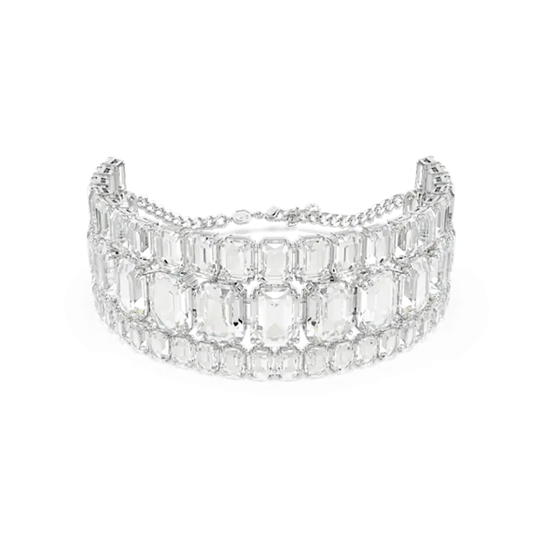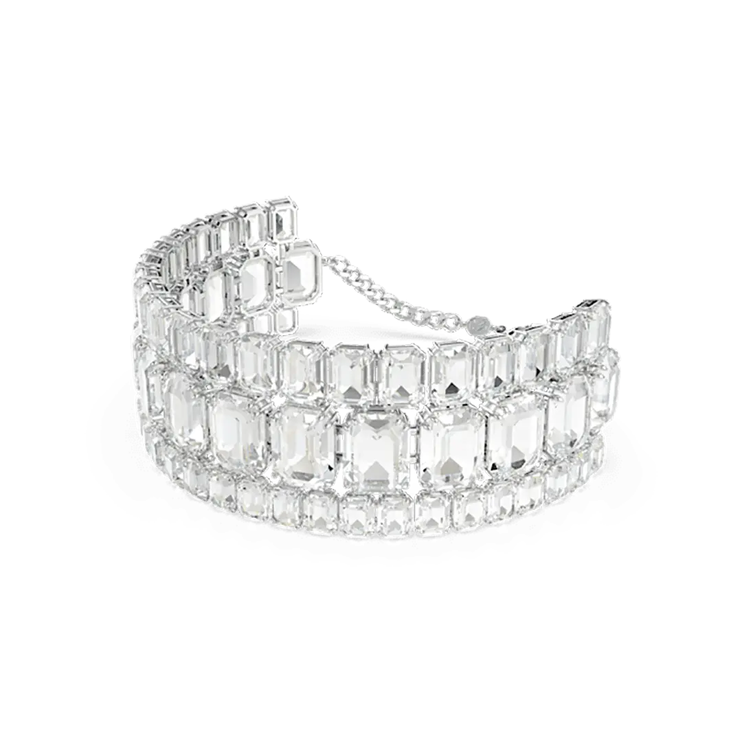 Empower your everyday style with this stunning Millenia choker. A glittering statement piece, the design is crafted with rhodium plating and features three radiant rows of clear octagon-cut crystals in varying sizes. This showstopping design is ideal for day-to-night fashion and a spectacular example of Swarovski’s mastery of light.