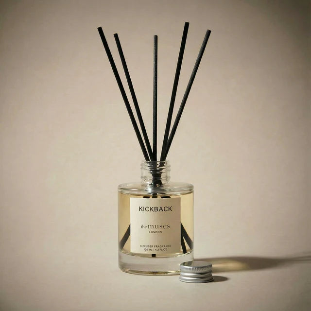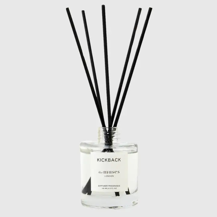 Perfect for those seeking to enhance their space with a refined scent, this 125ml diffuser offers a long-lasting fragrance experience without the need for flames or electricity. The glass base paired with natural rattan reeds ensures a beautiful aesthetic that complements any interior décor while efficiently dispersing the luxurious fragrance throughout your home. Ideal as a top-up for existing The Muses London enthusiasts or as an introduction to their signature scent collection, the Kickback Reed Diffuser transforms everyday moments into opportunities for mindful relaxation and sensory indulgence.